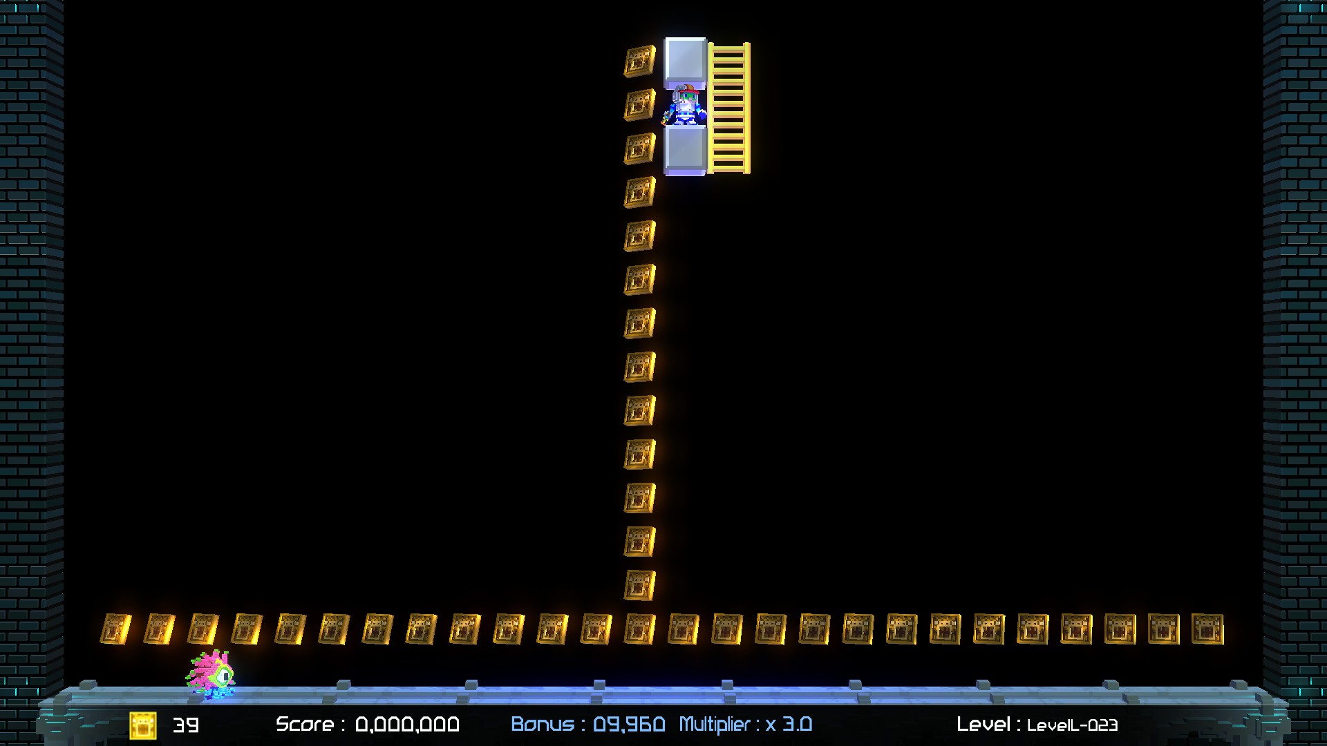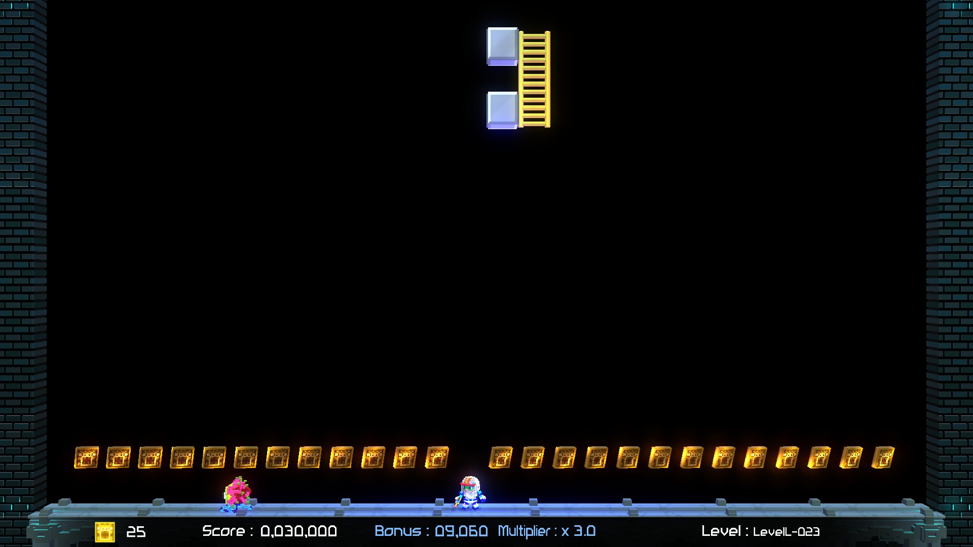 こちらは、他のプレイヤーが制作したオリジナルステージです。下を徘徊している敵の頭上に、タイミングよく落ちることで、すべての金塊を取ることができる構造になっています(頭上に乗るのはok)。