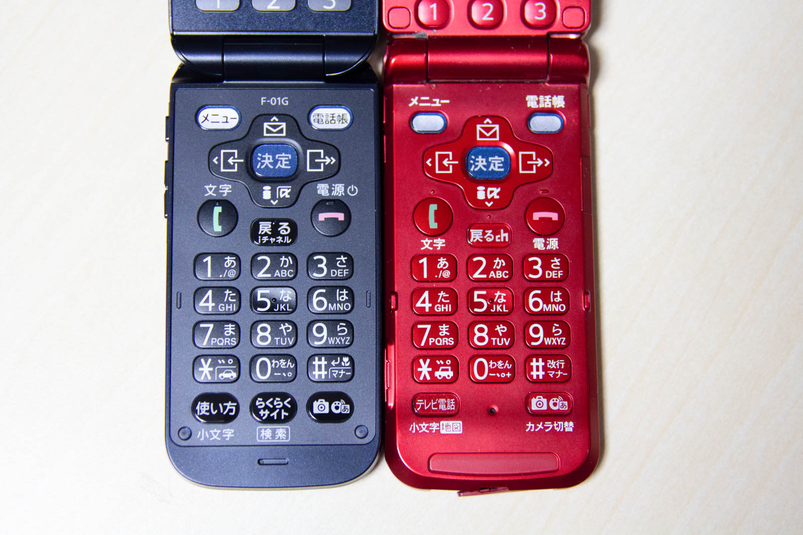 携帯電話の裏側を並べた様子です。新しい機種の方がひと回りほど小さく、ボディの四隅に丸みがあるため、手にしっくりと馴染みやすいデザインになっています。