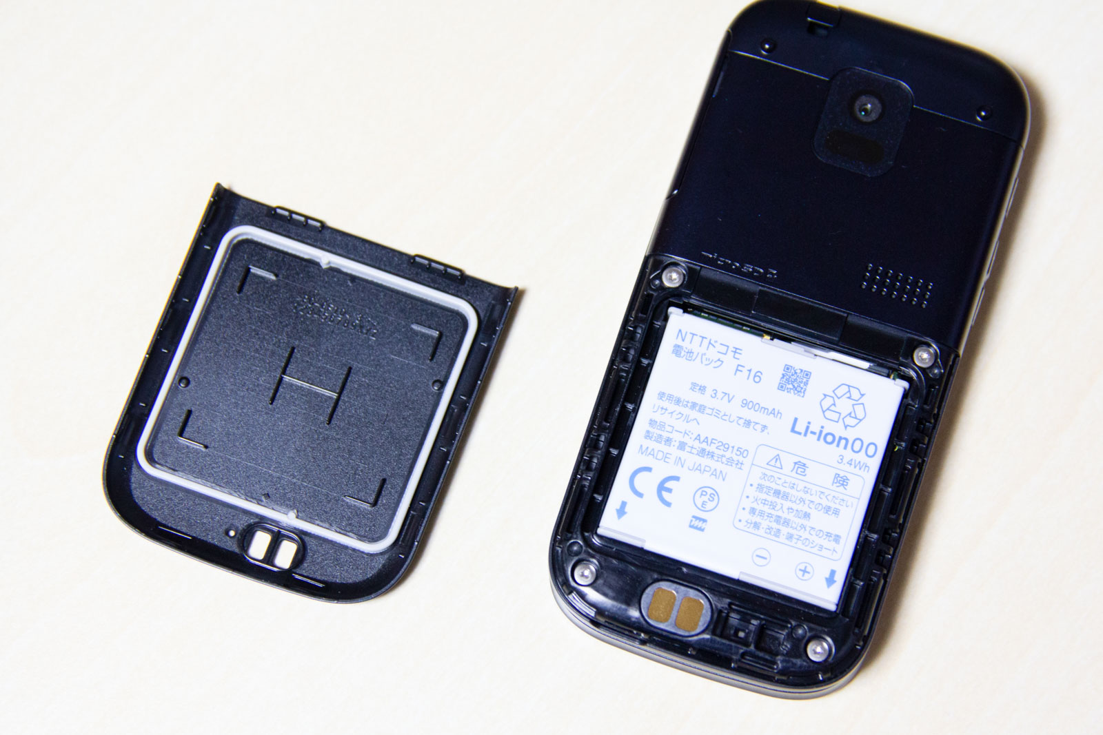 電池カバーを外した様子です。バッテリーには「F16」が採用されています。防水仕様のため、電池カバーの裏側には水の侵入を防ぐシール加工が施されています。