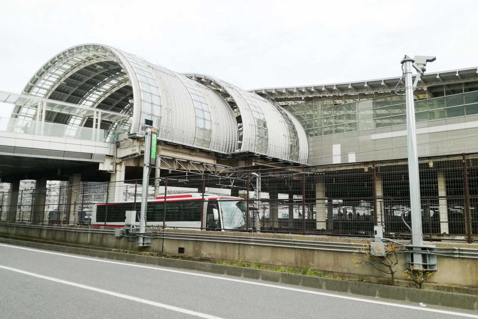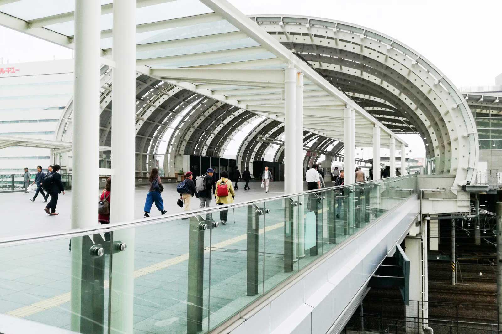 下から見るとこんな感じ。やや近未来的なデザインの駅です。
