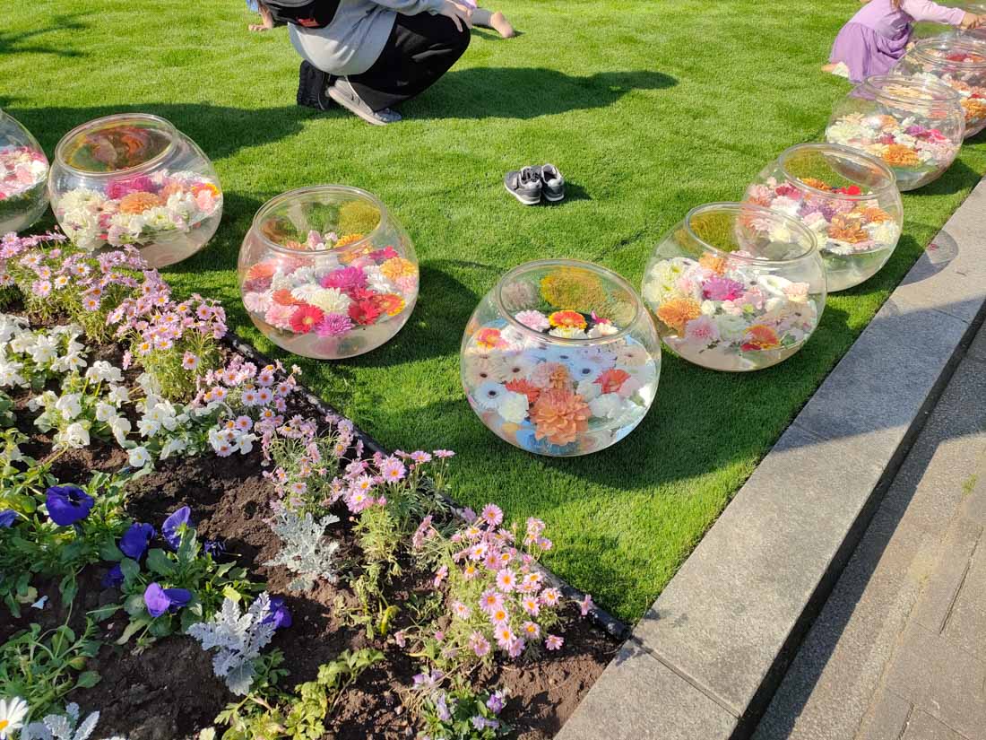 人工芝にした理由がわからなかったのですが、子供が気軽に遊べるようにすることだったんですね。水を張ったボウルの中に、色とりどりの花が浮かべられたオブジェが設置されていました。