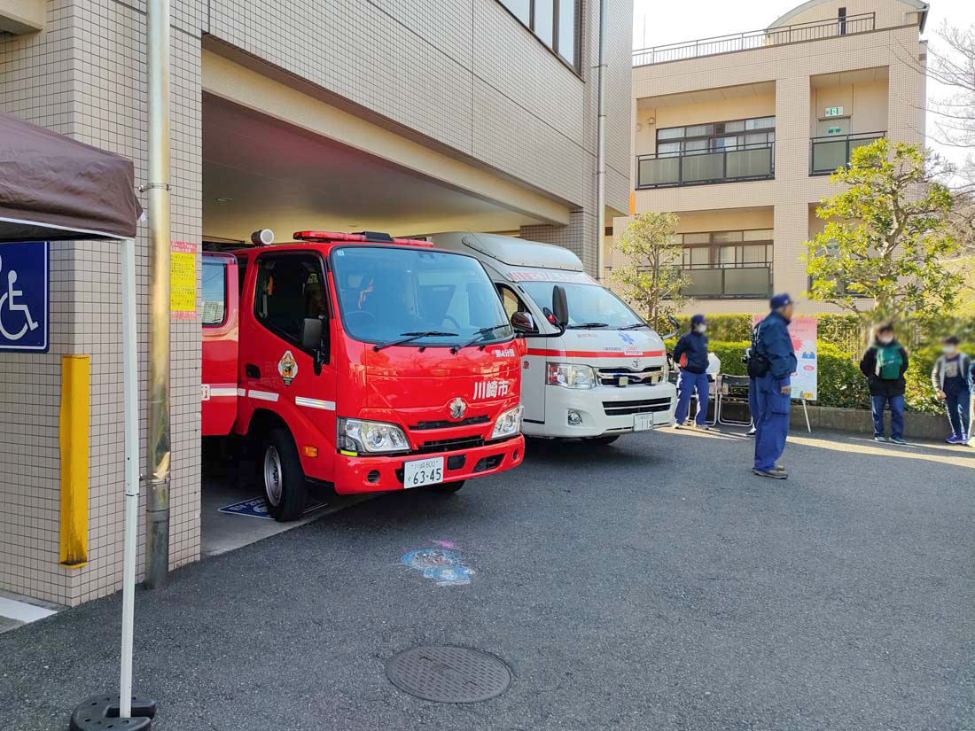 同じく2階の駐車場では、消防車・救急車の展示屋、木のブロックを使った積み木コーナーなどがありました。
