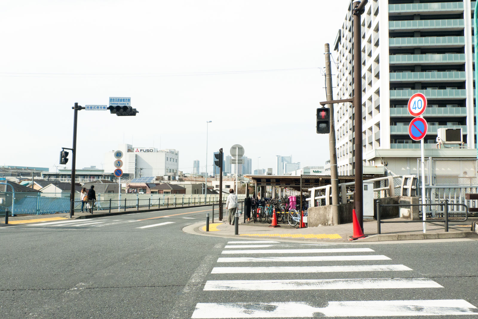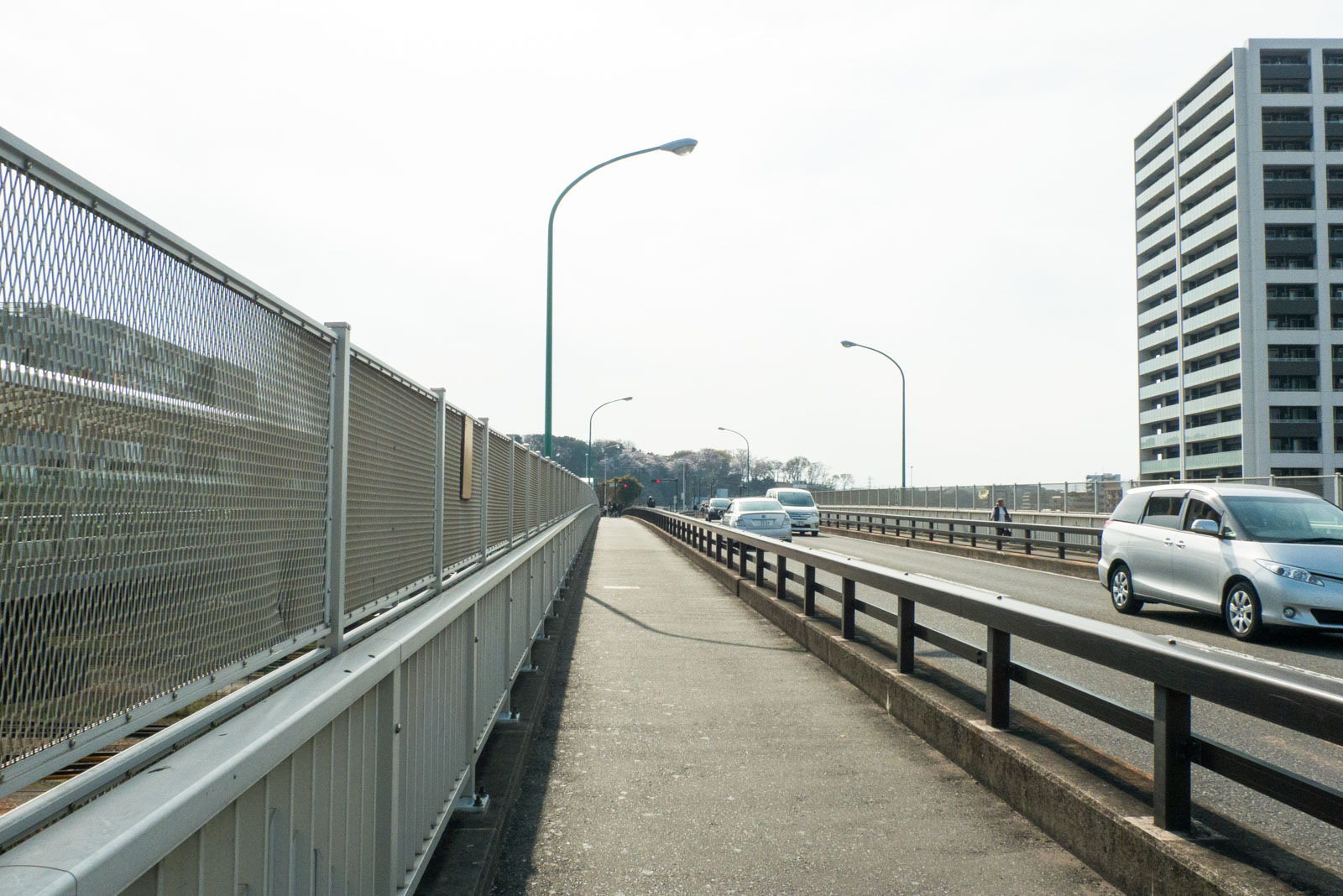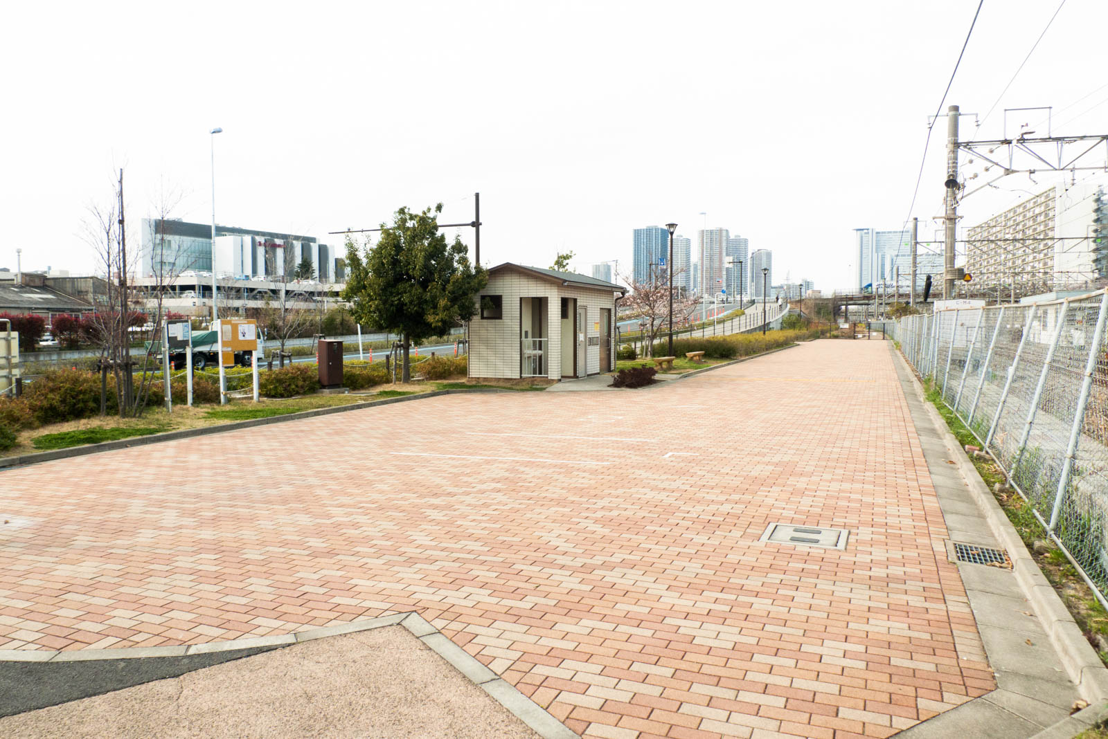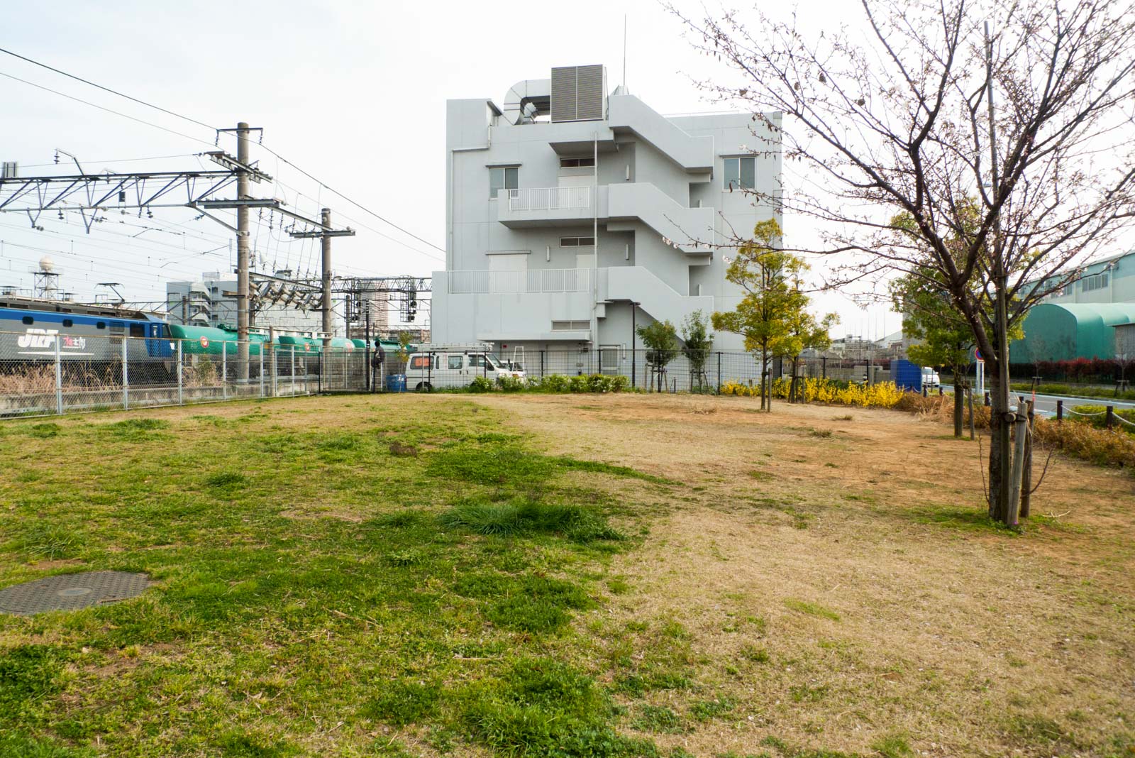 公園の手前端から眺めた様子です。左側に見えるのが三菱ふそうトラックの工場です。