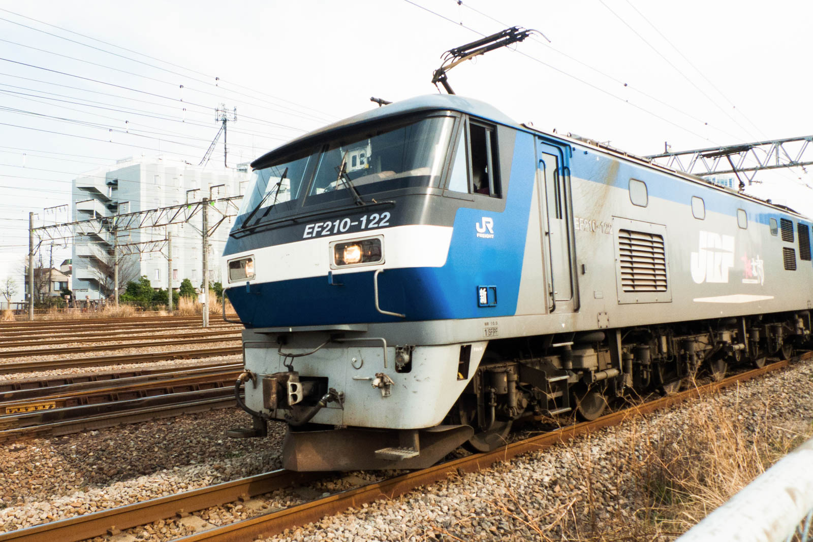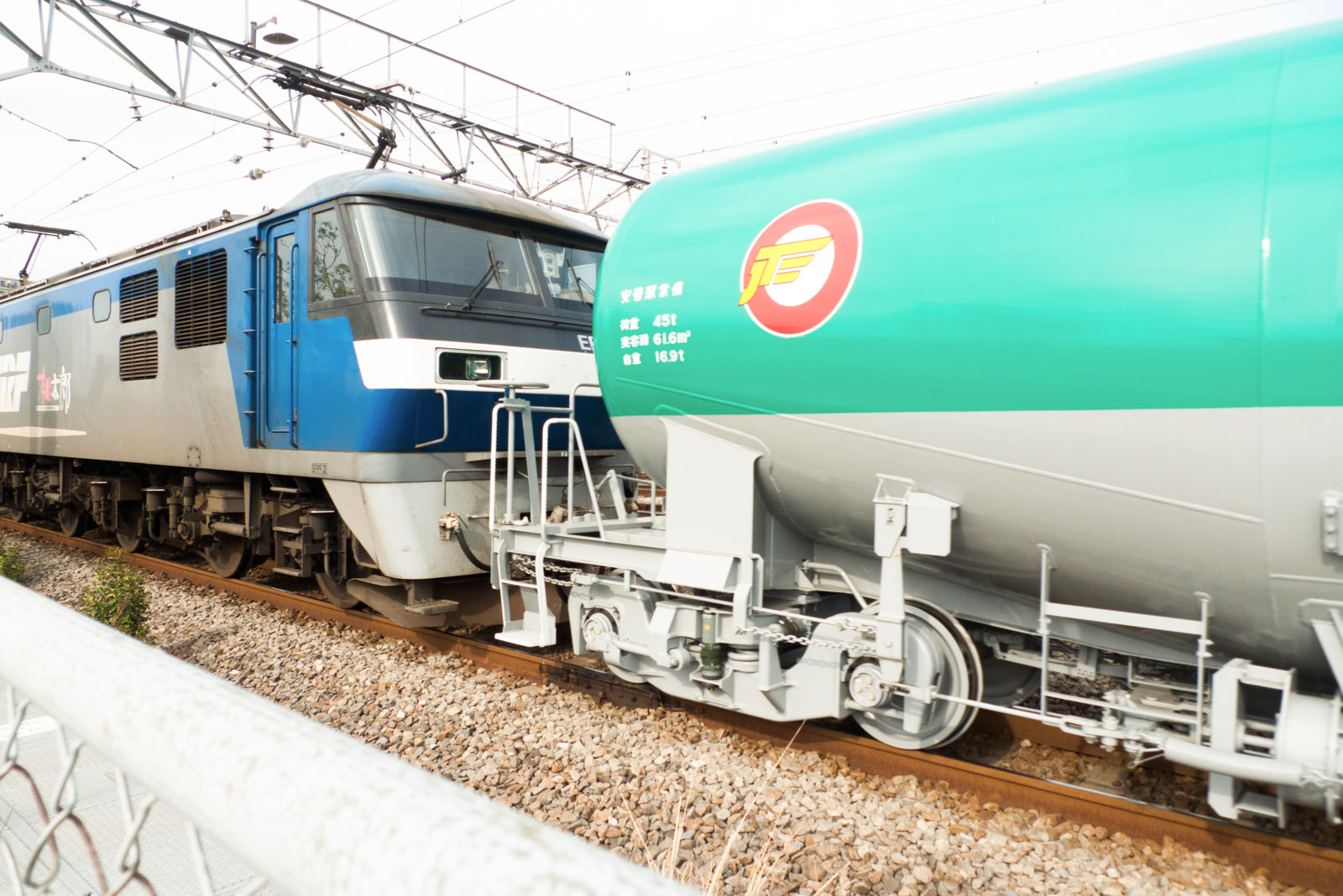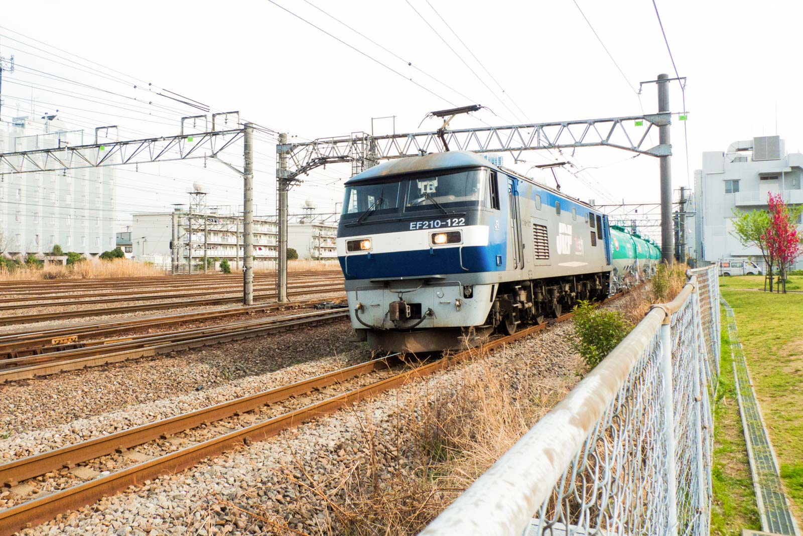 公園のすぐ横をJR貨物の電気機関車「EF210形」が走り抜けていきます。愛称は「桃太郎」。主にコンテナやタンク車などを牽引する貨物列車です。