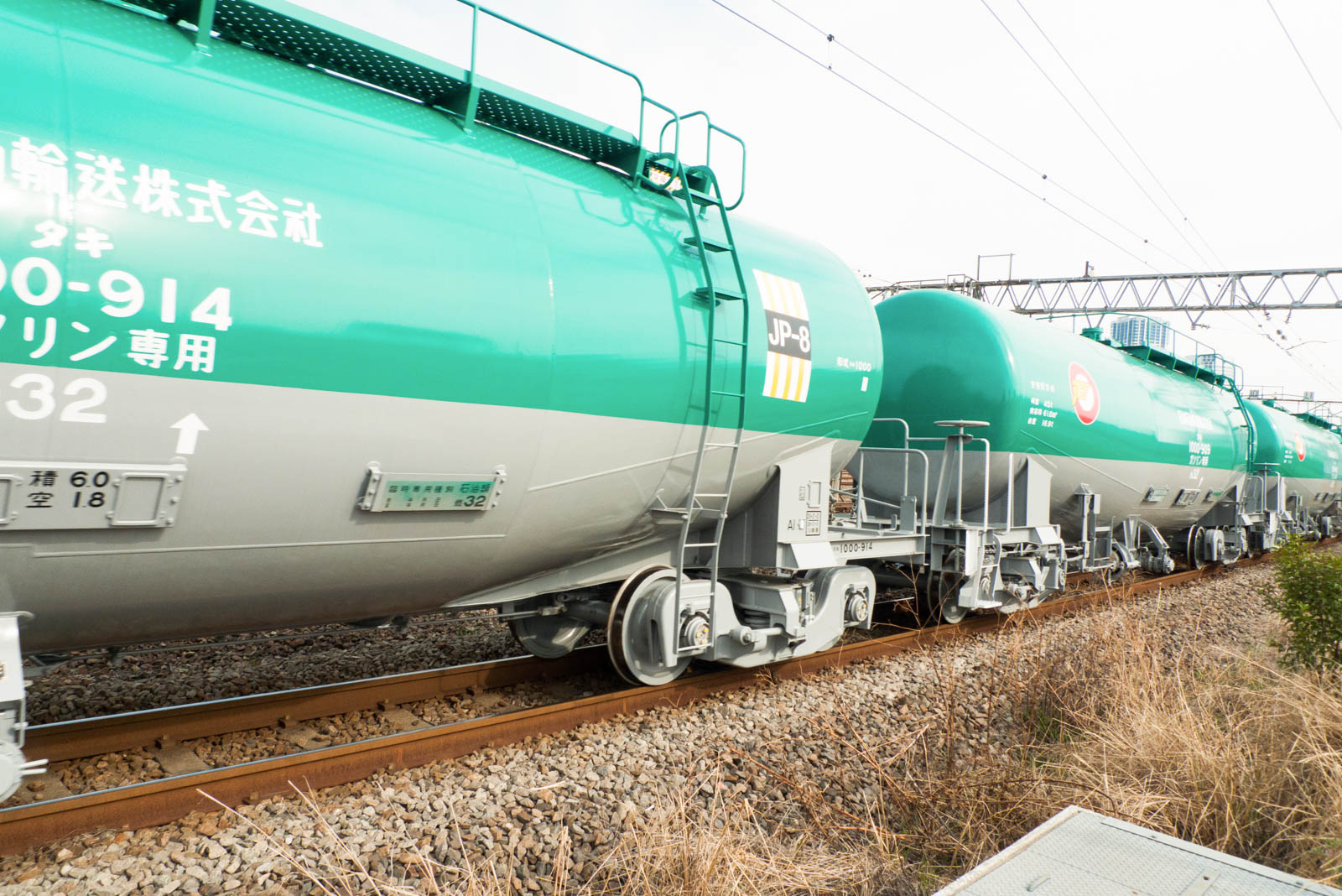 鮮やかなグリーンのタンク車がいくつも連なり迫力のあります。タキ1000形と呼ばれる車両で、ガソリンなどを運ぶ専用の貨車です。