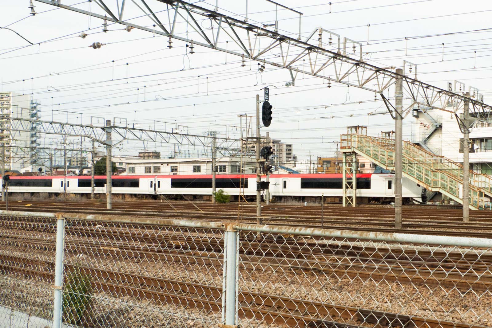 続いて、成田空港へ向かう特急「成田エクスプレス(N’EX)」が通過していきます。白と黒に赤いラインのデザインが印象的です。