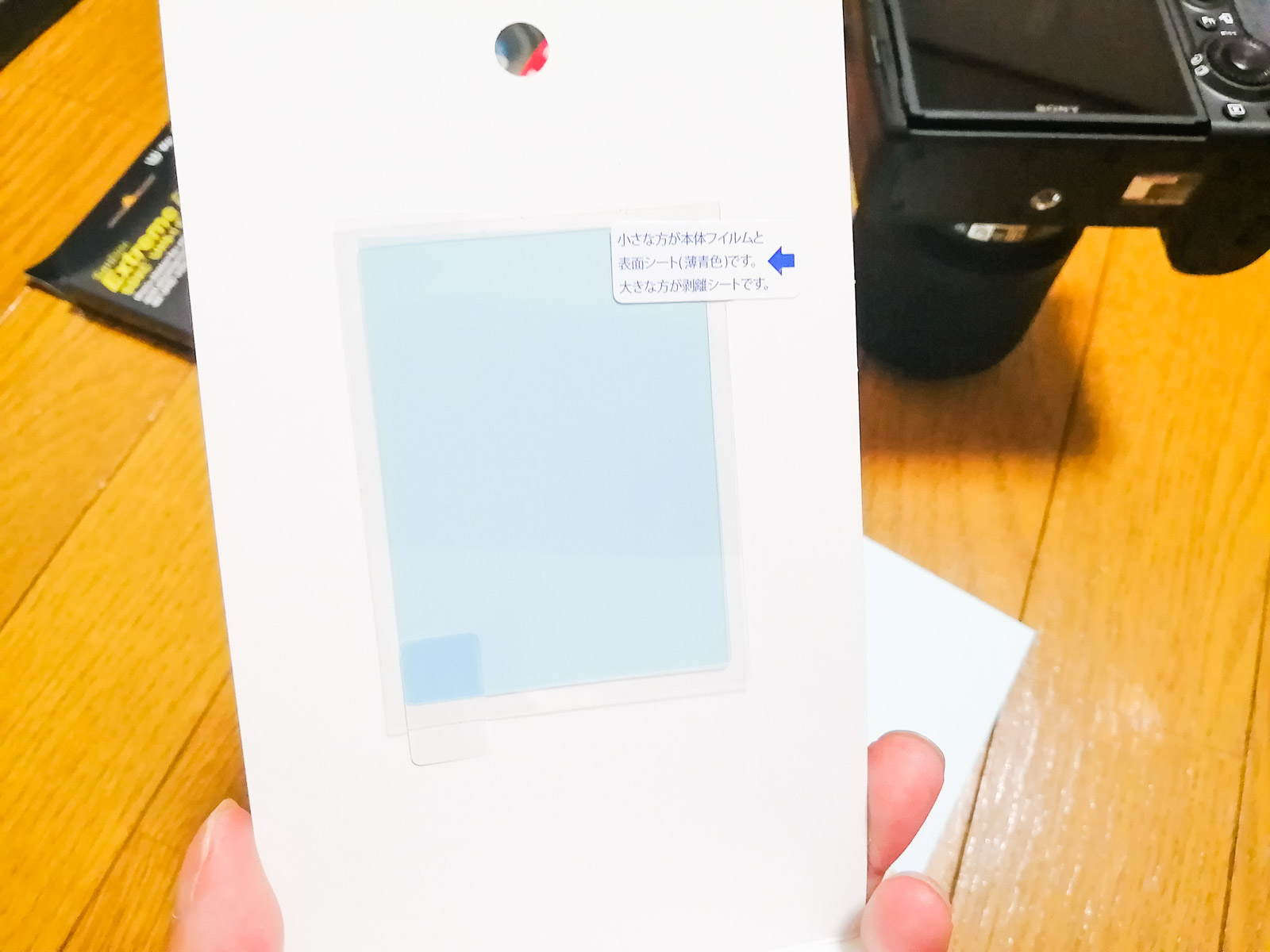 液晶プロテクター本体は中央の台紙に固定されており、貼り付け前に保護用のフィルムが両面についています。小さいシールで「どちらが表面・裏面か」が分かるようになっているため、貼るときに迷う心配がありません。