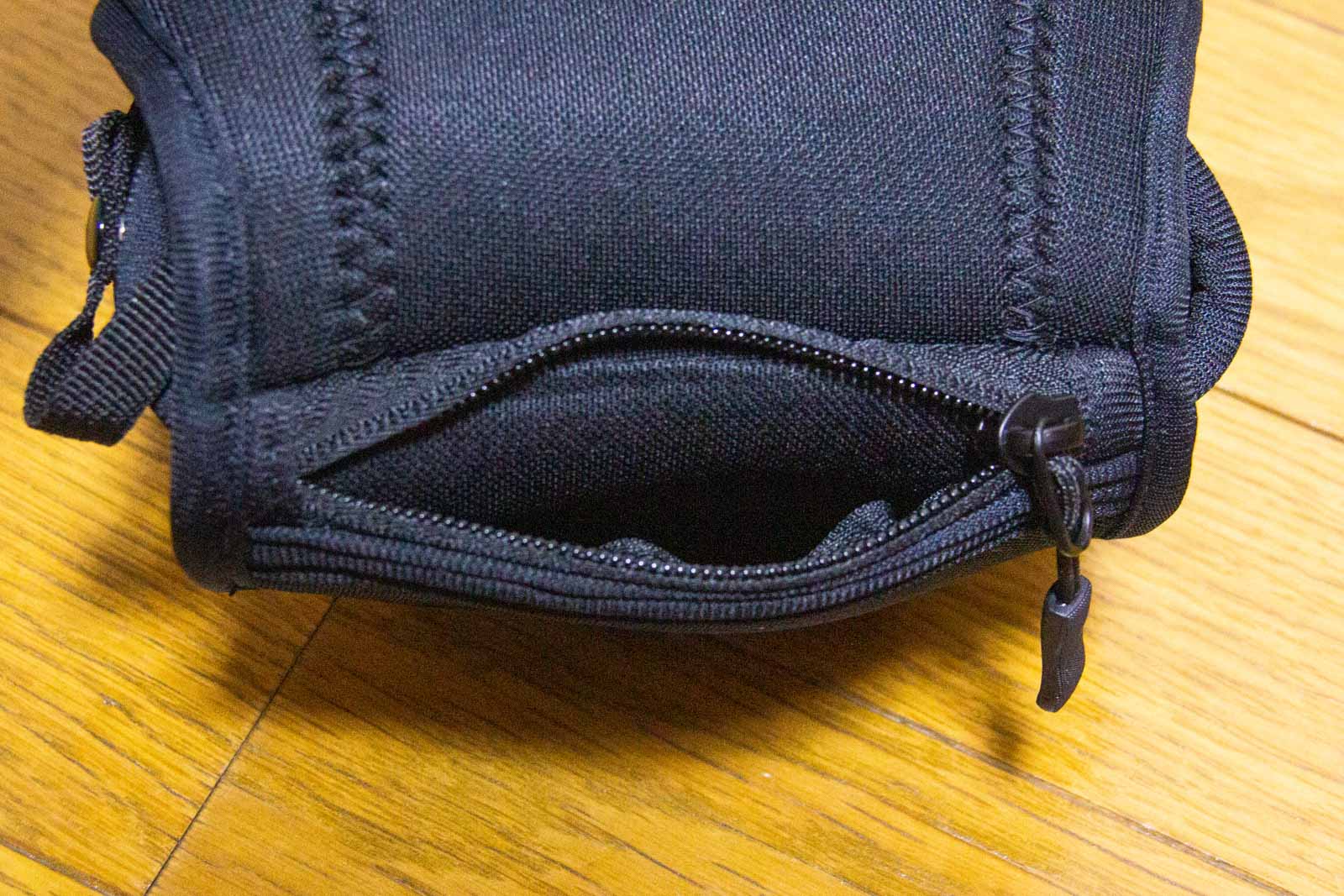 背面には小さなポケットが付いており、SDカードやクリーニング用のウェットティッシュなどを収納できます。ちょっとしたアクセサリーを入れておくのに便利です。