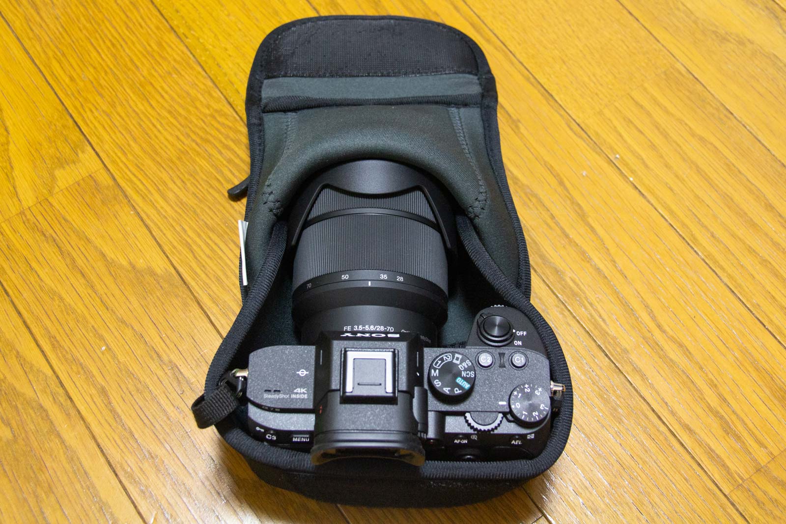 こちらは、移動中にカメラを保護するためのソフトケースです。クッション性があり、バッグの中でもカメラをしっかり守ってくれます。