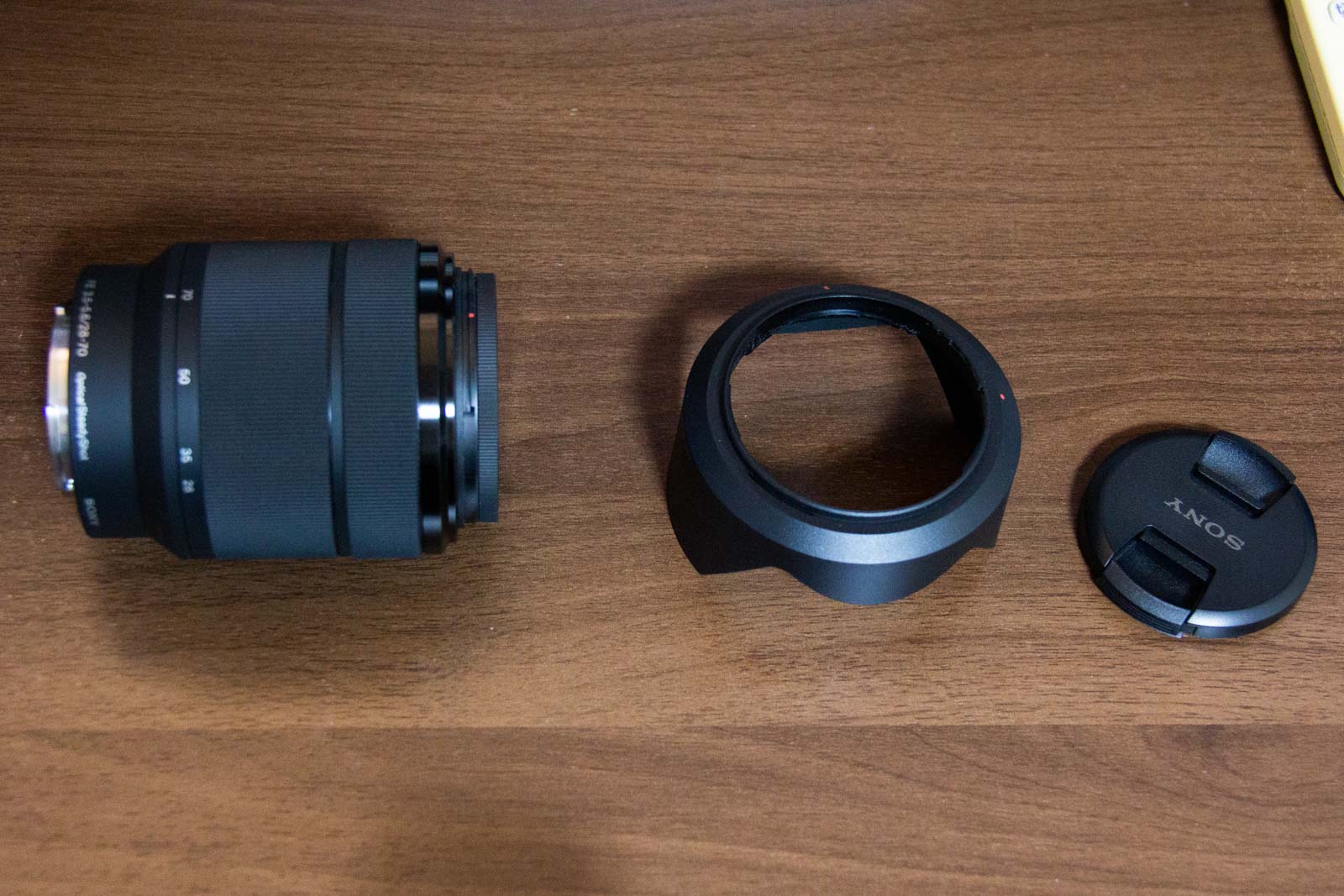 カメラ本体に付属しているレンズキットの標準ズームレンズです。内容は「レンズ本体」「レンズフード」「レンズキャップ」の3点構成になっています。