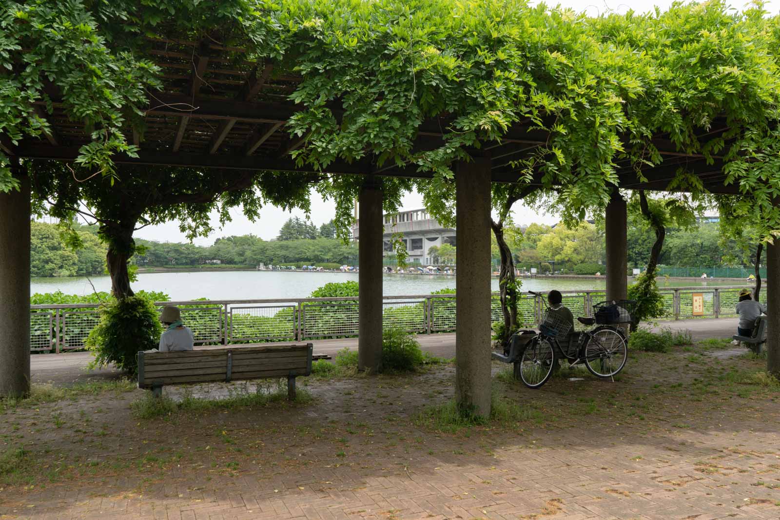 池の前には藤棚とベンチがあり、木陰でひと休みできる場所になっています。夏場は涼しい風が通り抜けて、ゆっくりと景色を眺めながら休憩するのにぴったりです。