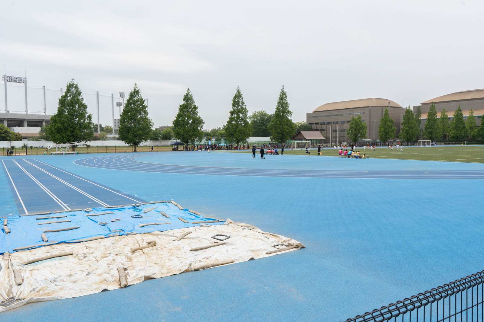 等々力補助競技場で、青いトラックが鮮やかです。陸上競技が行われるほか、中央の芝生では少年サッカーなども行われています。