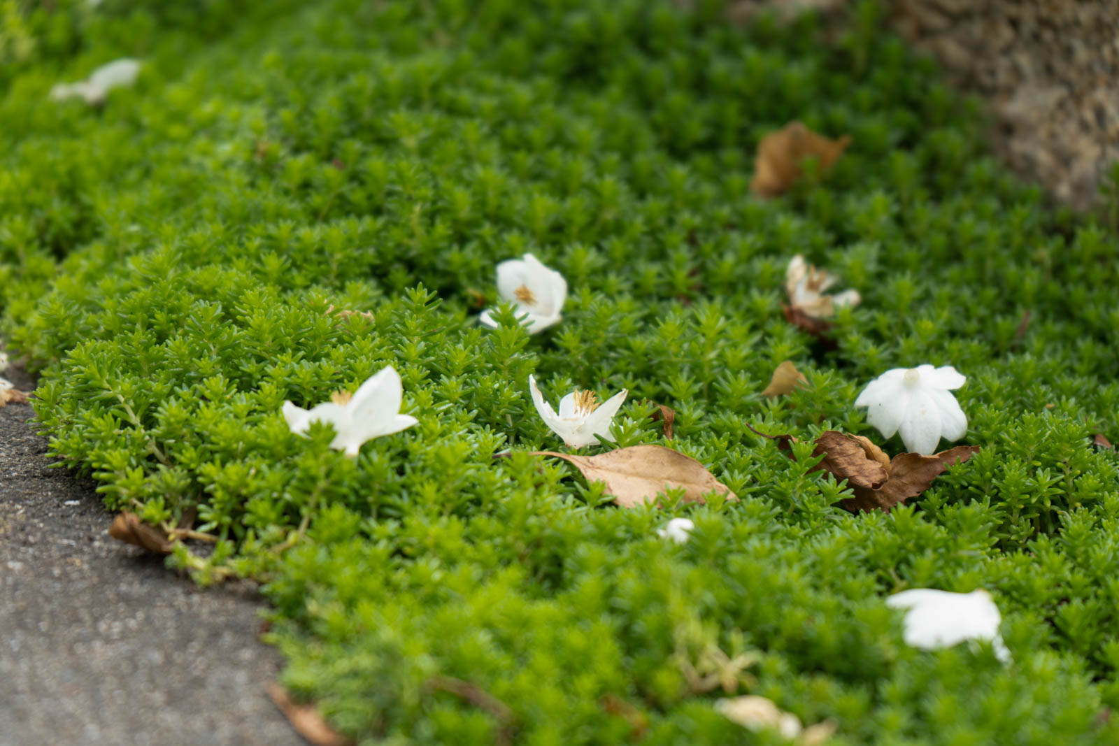 通路の端の石畳には、しっとりと苔が生えていました。ところどころに小さな白い花が落ちていて、まるで絵のような静かな風景です。