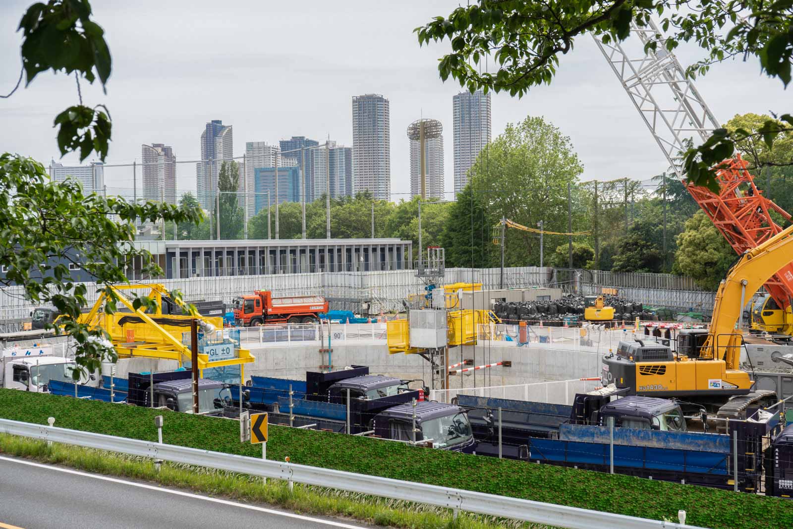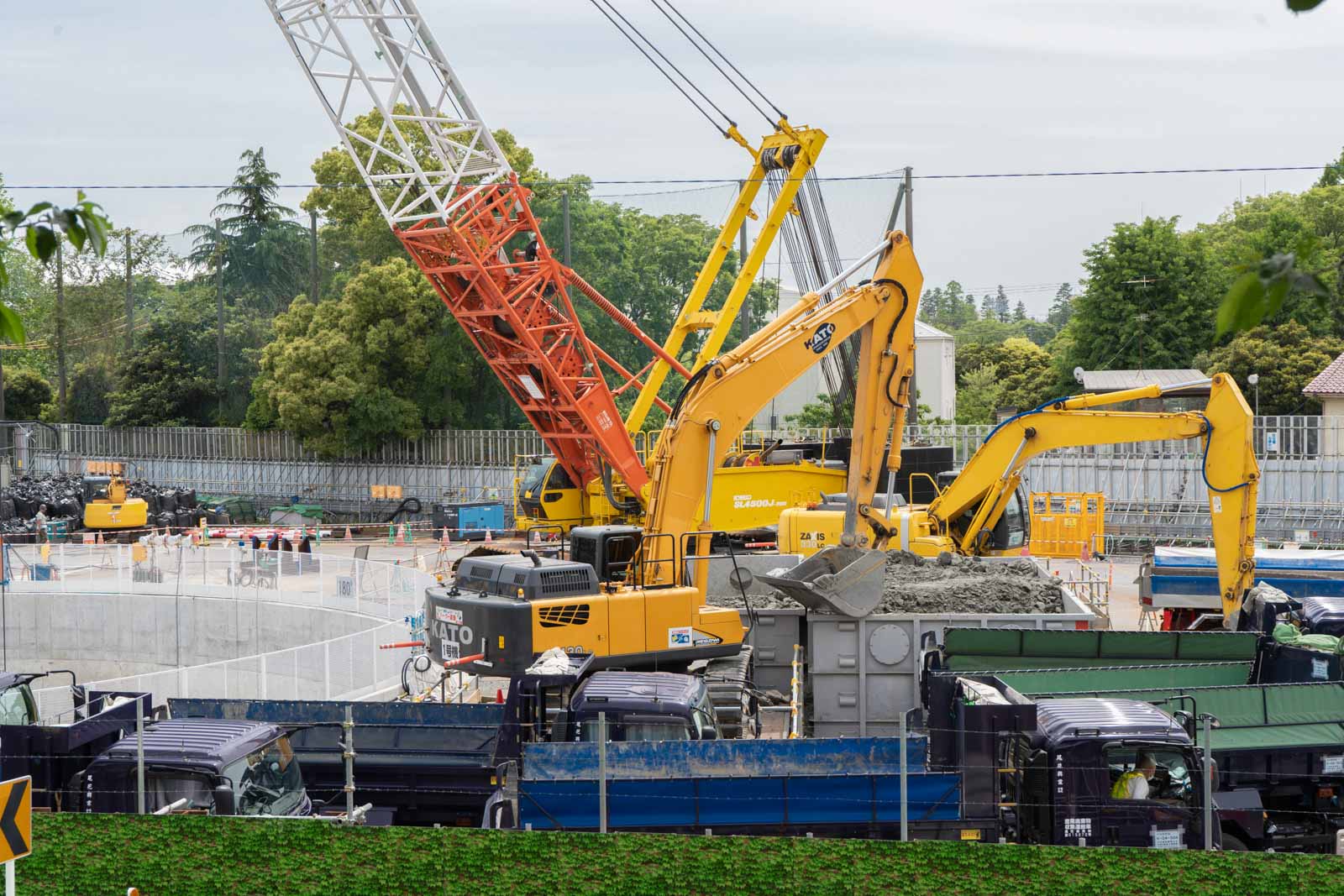 重機が忙しく動き回り、縦穴から掘り出した土を次々とトラックへ積み込んでいました。間近で見ると迫力があり、工事の規模の大きさを感じます。