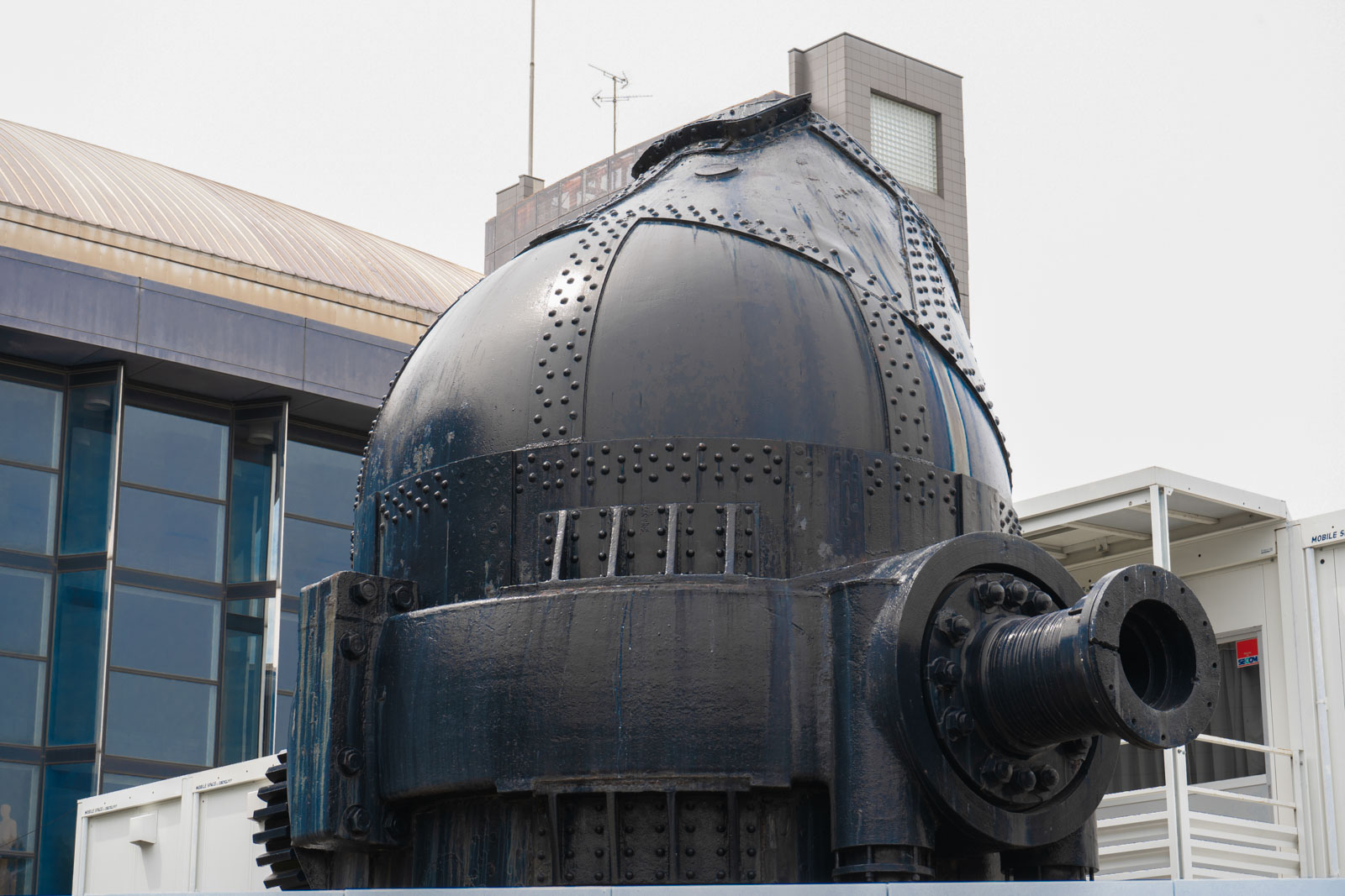 壁で囲われている川崎市民ミュージアムの前を通ると、「トーマス転炉」の上部が見えます。同館は、2019年の水害で所蔵品が被害を受けたため、現在は休館となっています。