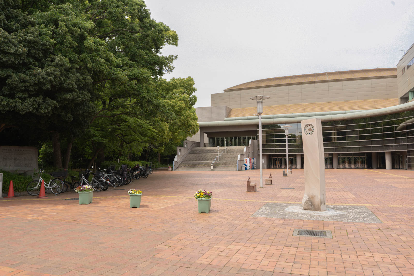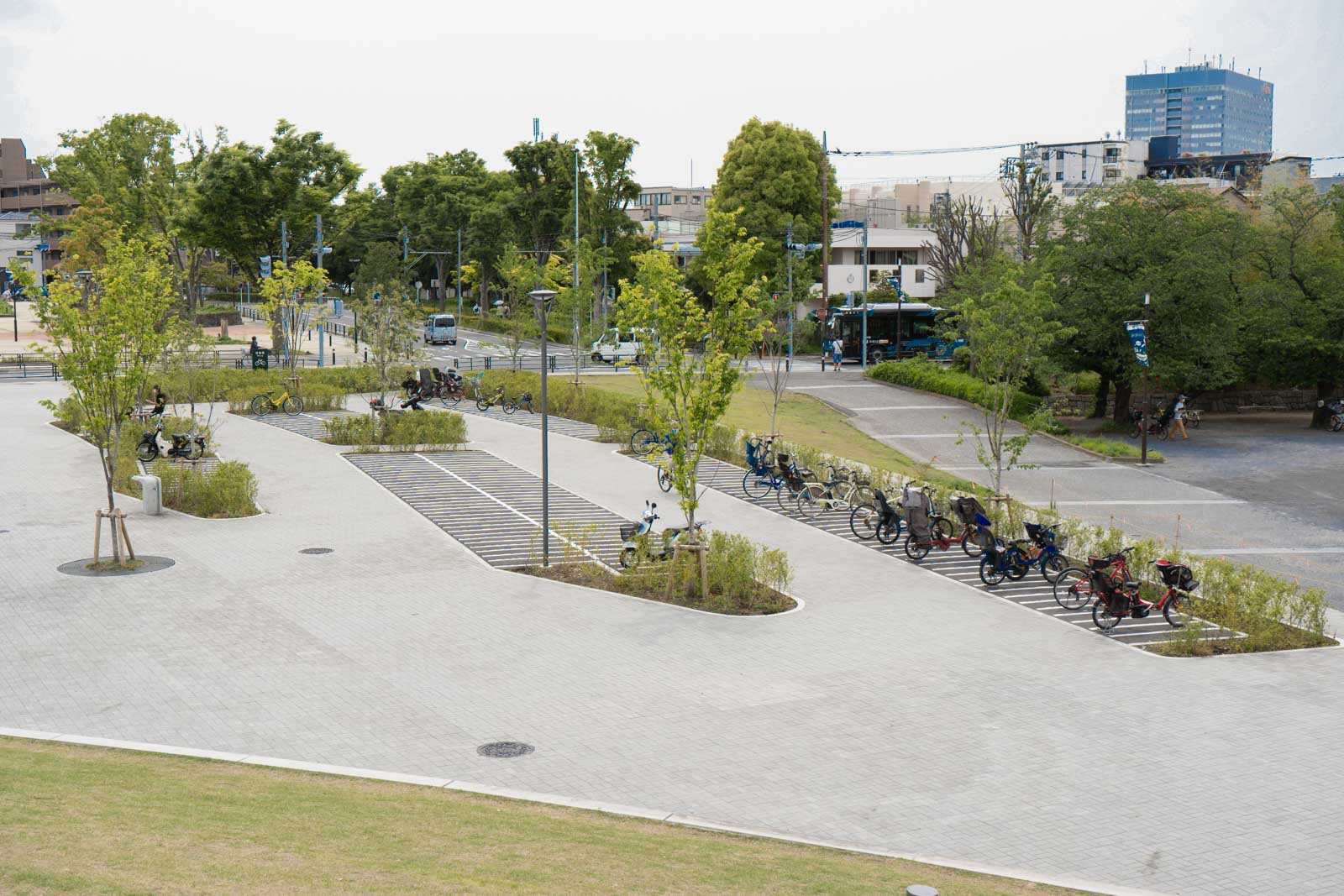 球場の上から等々力の入り口を眺めた様子。駐輪場があります。