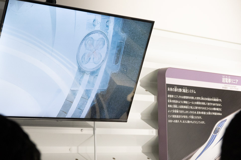 スタッフの方が液体窒素で冷却すると、模型が磁力で浮上し、滑るように走行する様子を間近で見ることができます。