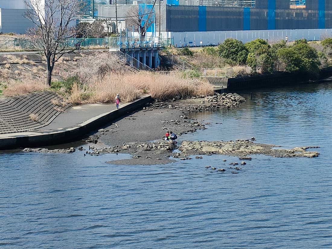 川の水位が下がり、普段は水中にある地面が姿を現していました。子どもたちは、その場所で何かの虫を探している様子でした。