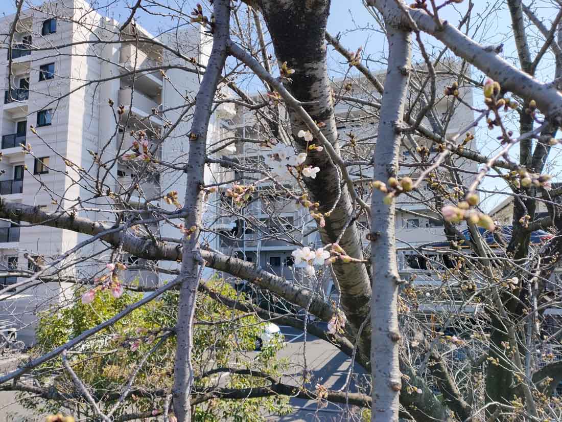 土手に植えられている桜の木から、桜の花がポツポツと出始めました。