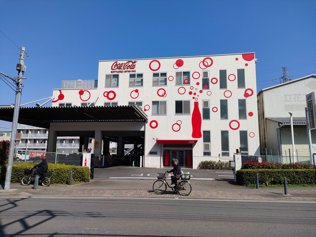 すぐそばには、コカ・コーラの営業所があり、コーポレートカラーの赤を基調に、ドリンクのイメージが描かれています。