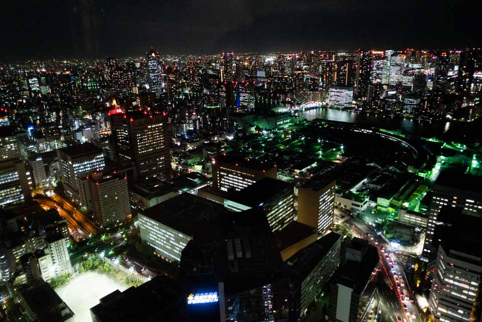 写真奥の緑色のライトで覆われた部分が築地市場です。