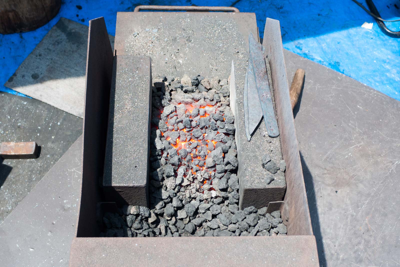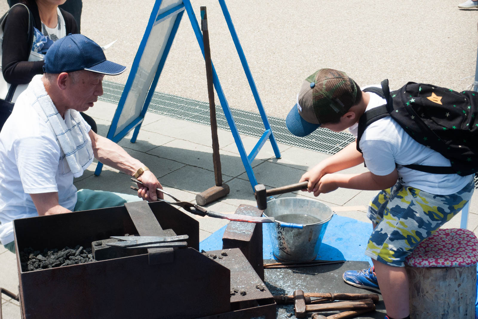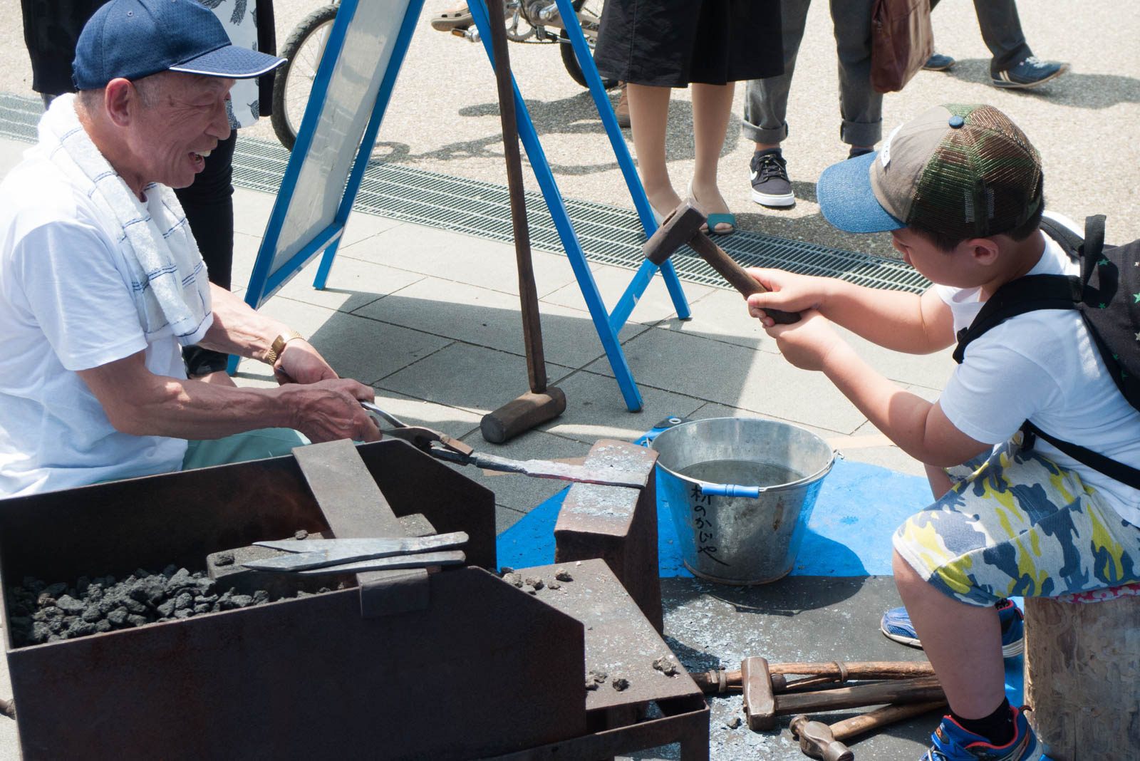 打刃物(読み:うちはもの)の体験コーナー。ハンマーを持ち上げて・・・