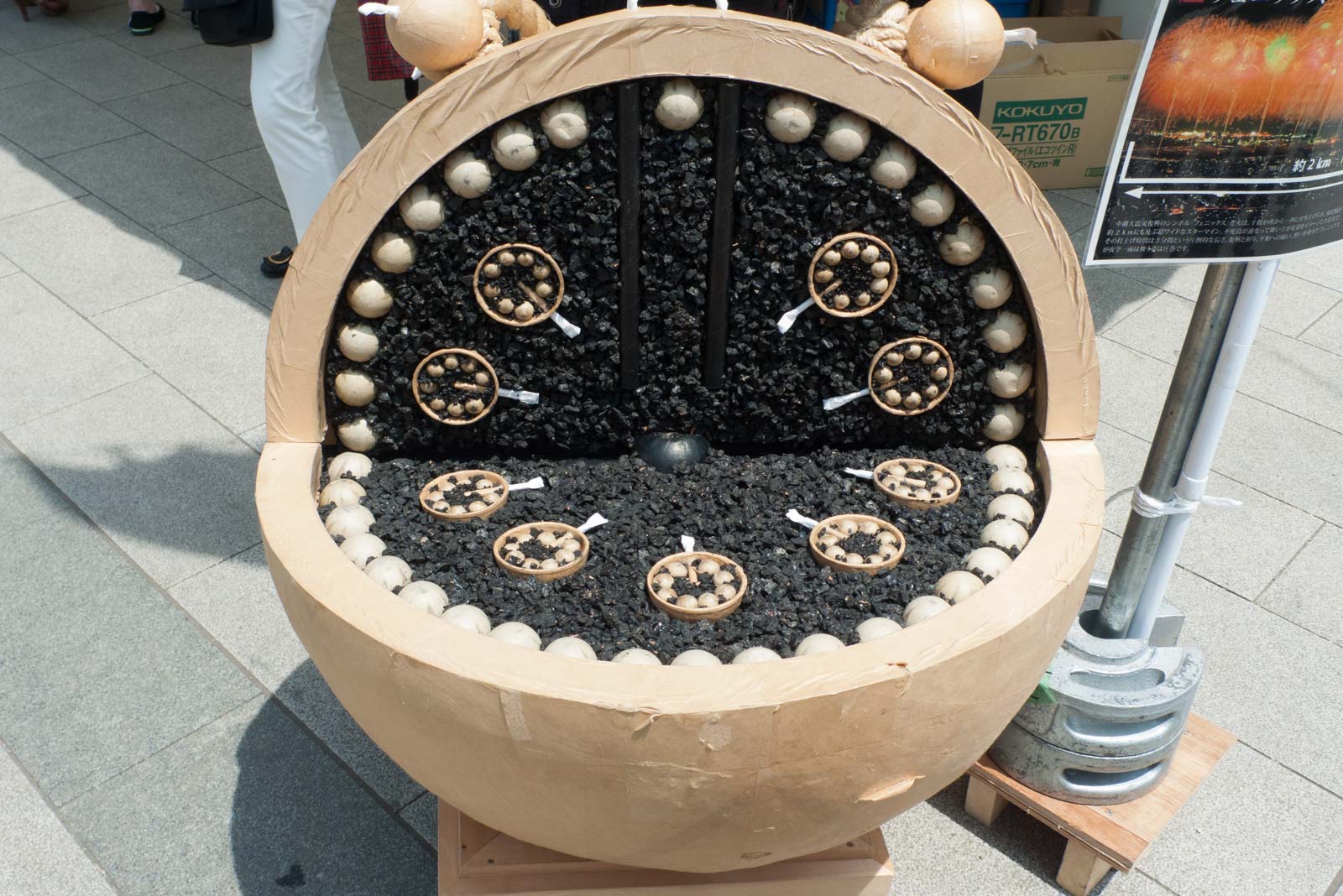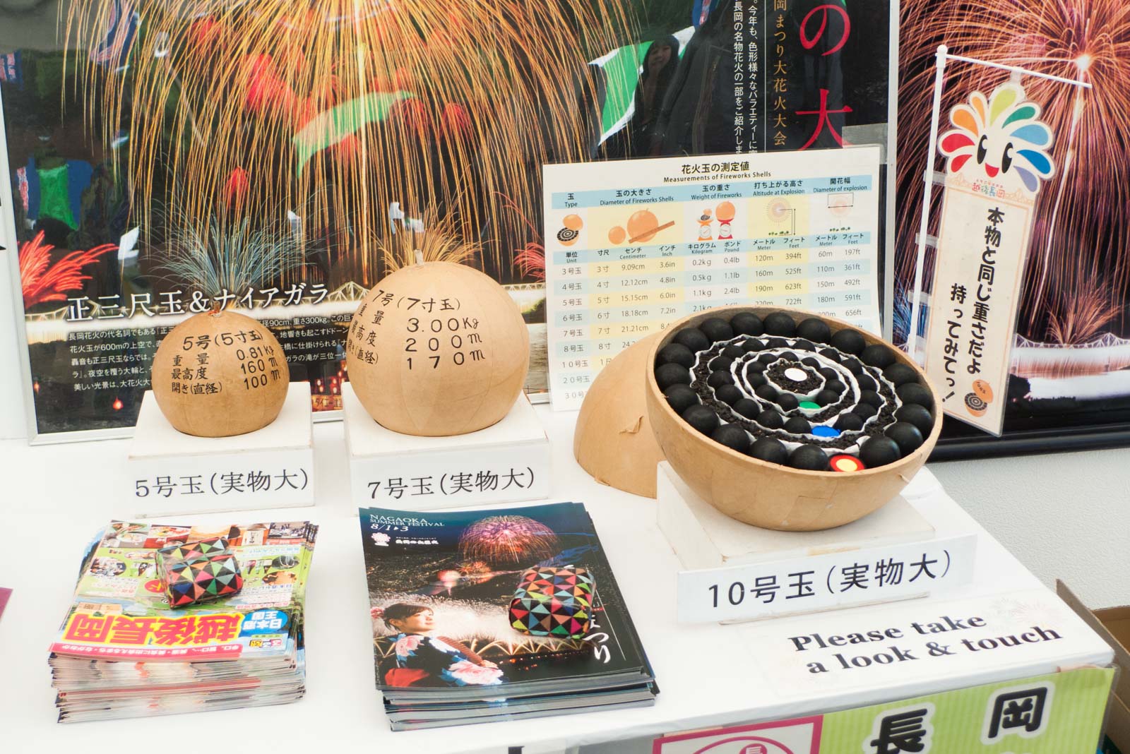 長岡花火の案内をしているコーナー。花火玉の種類や中身が見られます。
