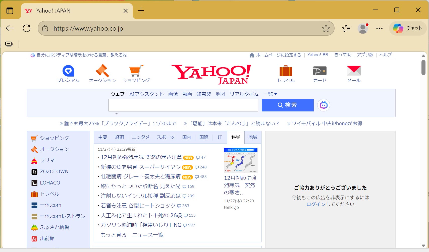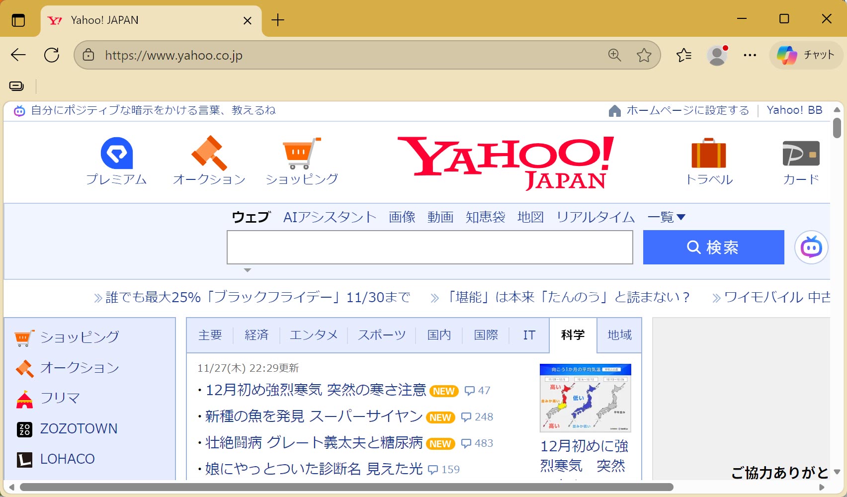 すると、このようにホームページの文字が大きくなりました。逆に文字を小さくするには、「Ctrl」キーを押しながら、マウスの真ん中にあるローラーを手前に向かって回転させます。