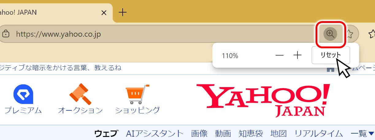 また、変更前の文字の大きさに戻すには、アドレスバーの右側にある「虫眼鏡マーク」をクリックします。