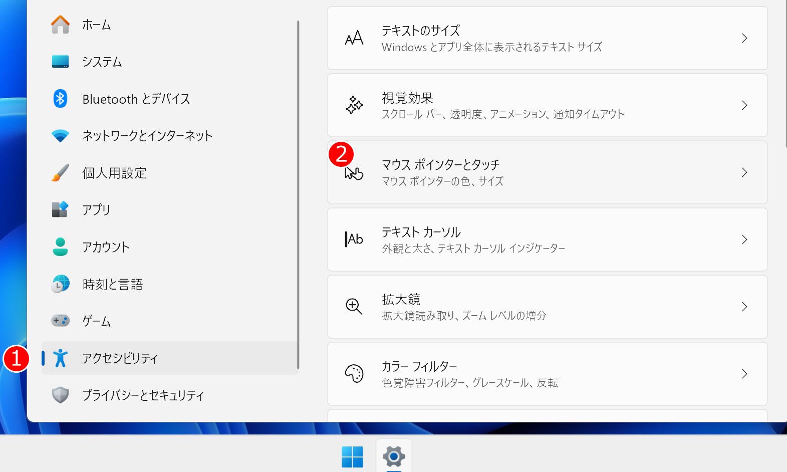 ② 右側に表示されたリストの中から「マウスポインターとタッチ」をクリック。