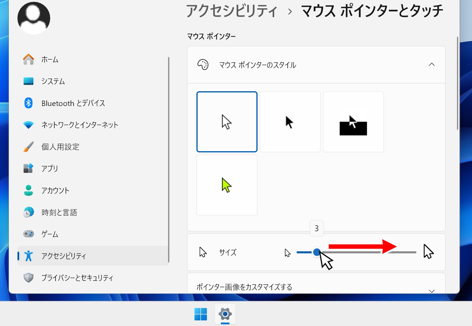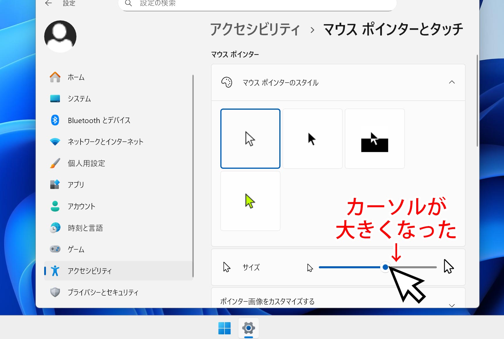 するとマウスカーソルが大きくなりました。つまみを左右に動かすことでお好みのサイズに変更することができます。