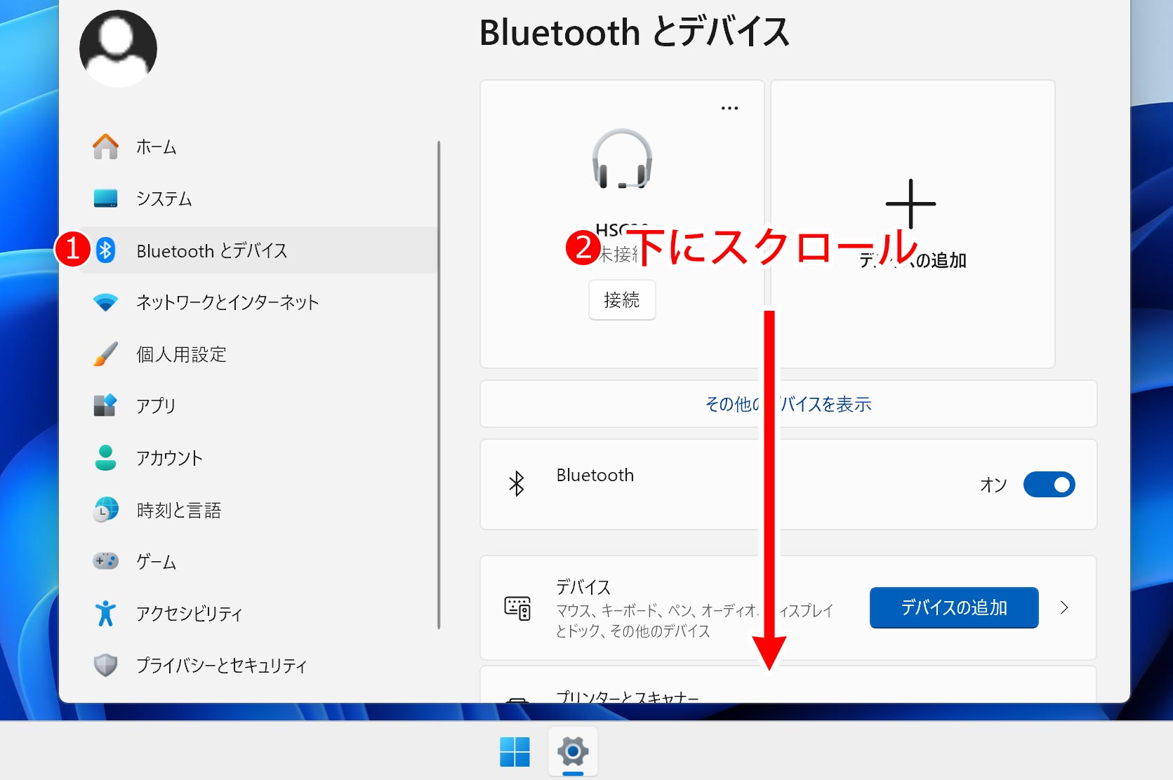 ① 左側にあるリストから「Bluetoothとデバイス」をクリック。