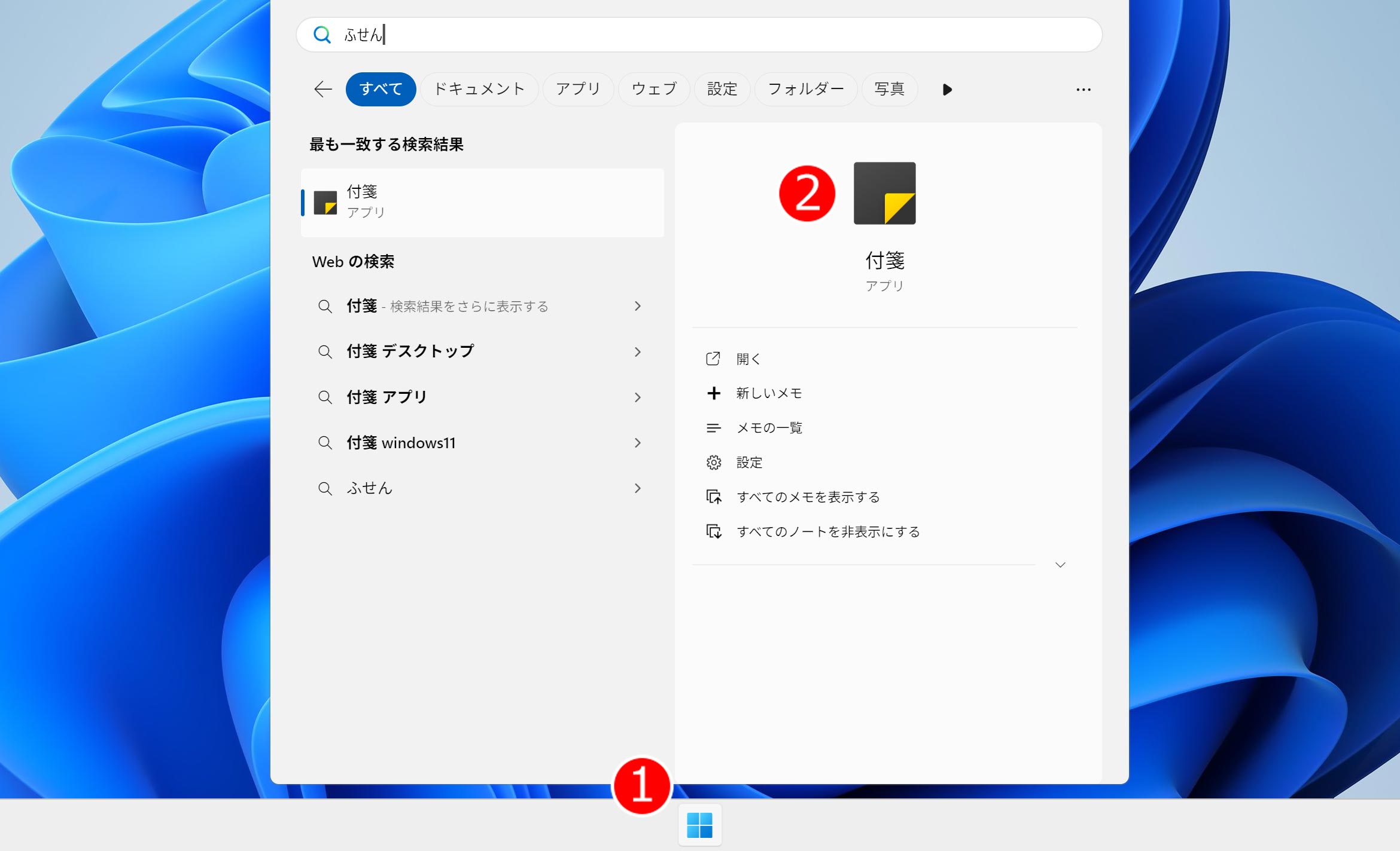 ② メニューが出るので「ふせん」と入力します。すると「付箋アプリのアイコン」が出てくるのでクリックします。