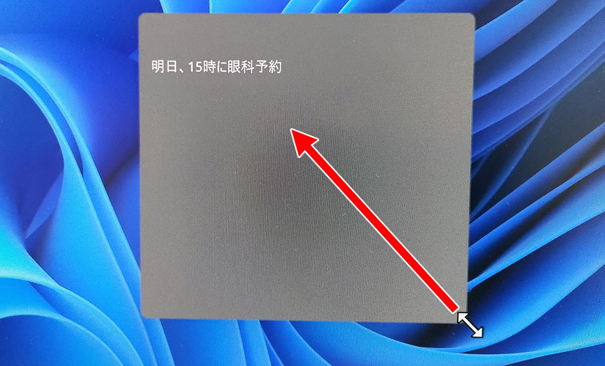 今のままだと、文字に対して付箋のサイズが大きいので小さくしてみます。付箋の右下にマウスカーソルを合わせ、斜めの矢印に変わったら左ボタンを押したまま、ちょうど良い大きさになるまで動かします。