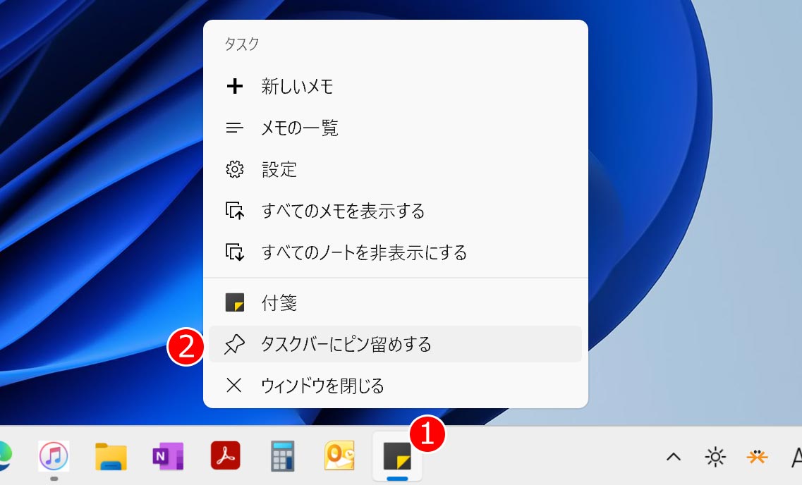表示されたメニューの中から「② タスクバーにピン留めする」をクリックします。今後は、ここに表示された付箋アイコンをクリックするだけで、すぐに付箋を開けるようになります。